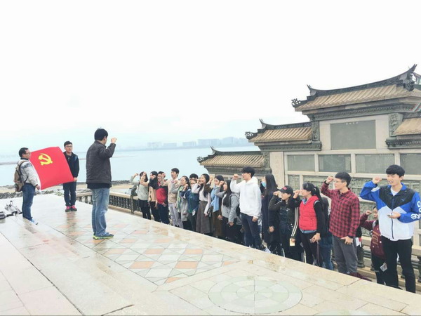 同学们面对集美解放纪念碑,面向党旗,诵读了入党誓词,体会党员的责任、荣耀和使命。